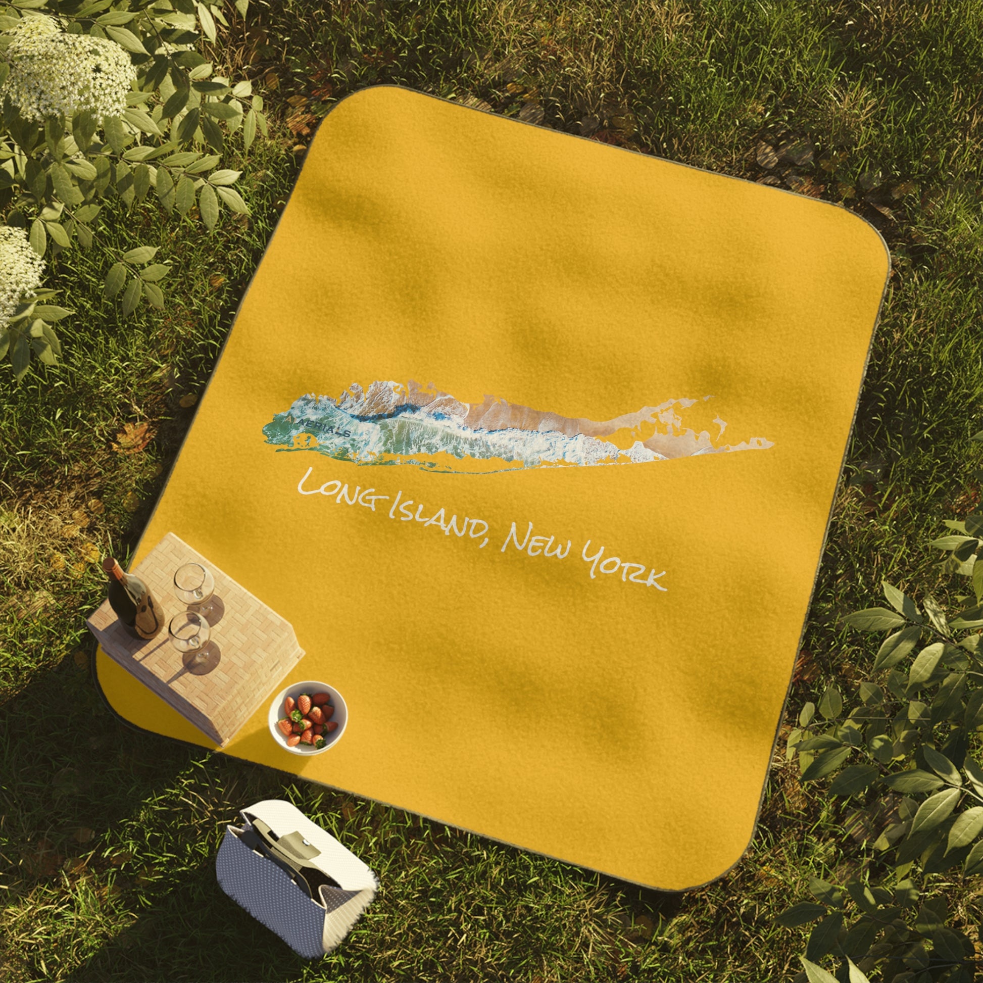 Whether it's a lovely picnic or a day at the stadium watching a favorite team, this blanket brings on the warmth. Made 100% with soft mink polyester on the top and water-resistant oxford cloth underneath, this custom Long Island picnic blanket is the perfect take-along for any excursion. Each blanket comes with a buckled carrying strap included. Featuring beach waves in Southampton, NY taken with a drone by A1 Aerials, LLC.