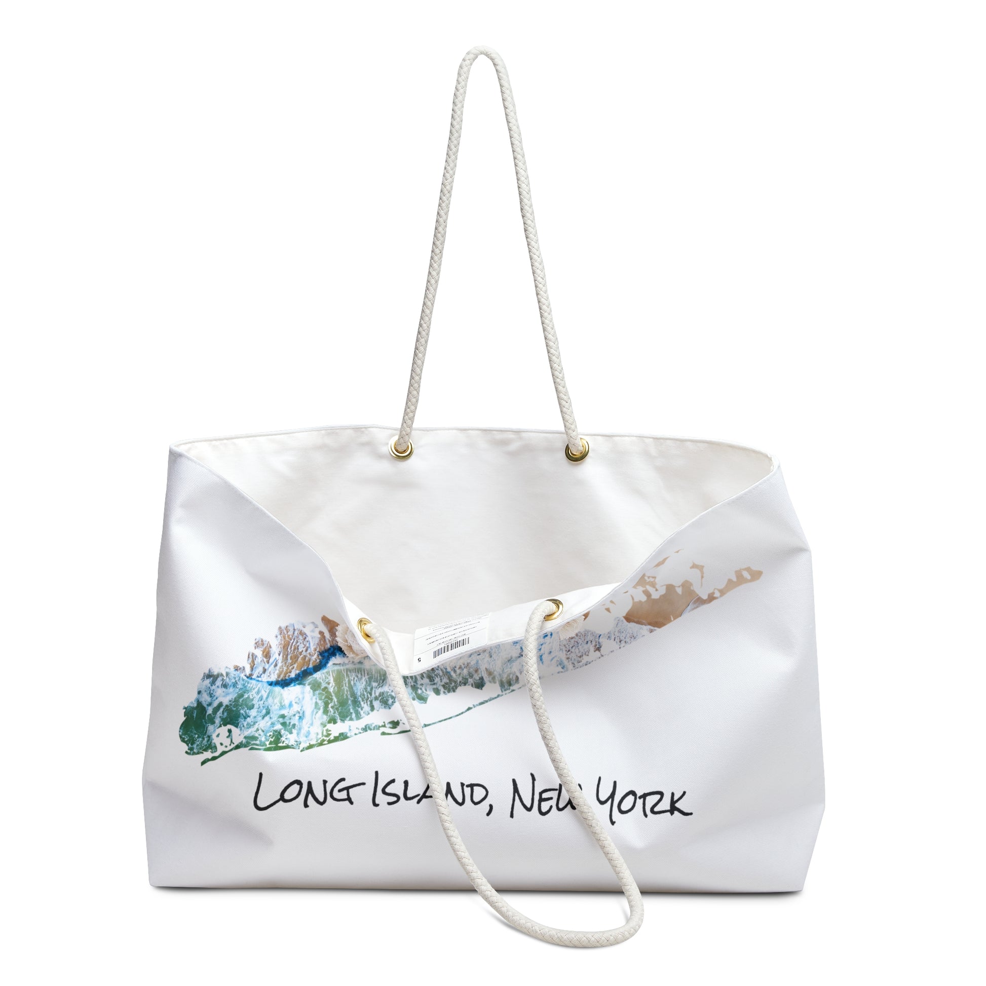 Our oversized Weekender Tote is perfect for your weekend at the beach or in town. The wide-mouthed, durable bag holds a generous amount of personal items and is easily held by its thick rope handles. Featuring beach waves in Southampton, NY taken with a drone by A1 Aerials, LLC.